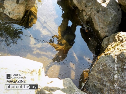 At our family reunion in Roaring River, Missouri, the family always loves to fish along the river. It has very clear, cool water and you can see reflections in it along the edges. The sun was just right and I was able to capture the reflection of my nephew fishing along the bank in the water. The reflection makes it appear that the photo is upside down.
