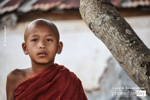 Burmese monks always wear dark saffron robes, which is inspired by “Saffron Revolution” given to the 2007 marches by Buddhist Monks to protest against the military regime of Myanmar. Neophyte young monks are met frequently when visiting monasteries and temples. Here you see the portrait of such one.