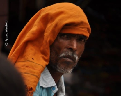 This candid of a man in Pune, who covered his head with an orange colored cloth as a shade from the sun is one of many photographs I took during my trip to India. The man was riding a bicycle when looked towards me with a pointed lens on him.