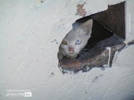 This little kitten appeared to be living in the cavity of a property wall bordering the roadway. It caught my eye with it’s unusual colored eyes, it’s white fur, in a white wall. A fleeting shot that is a once in a lifetime chance encounter as I walked along the road.