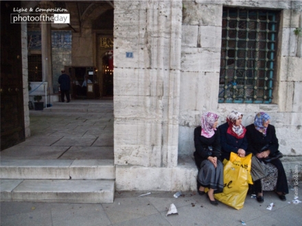 Three generations of women sit outside of an old mosque down along the Bosphorus, watching the crowd go by, as one of their husbands goes inside to pray.
