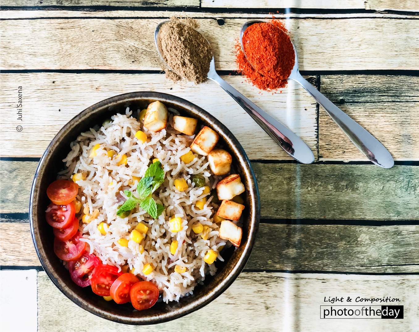 This photograph is of ‘Corn Pulao’ (a rice dish) prepared by me at home. When I was not in a mood to cook an elaborate meal, I prepared this super simple one pot one shot dish. Seasoning with cottage cheese and cherry tomatoes made it more delectable. The two spoons with spices on them show the importance of spices in making a recipe delicious.
