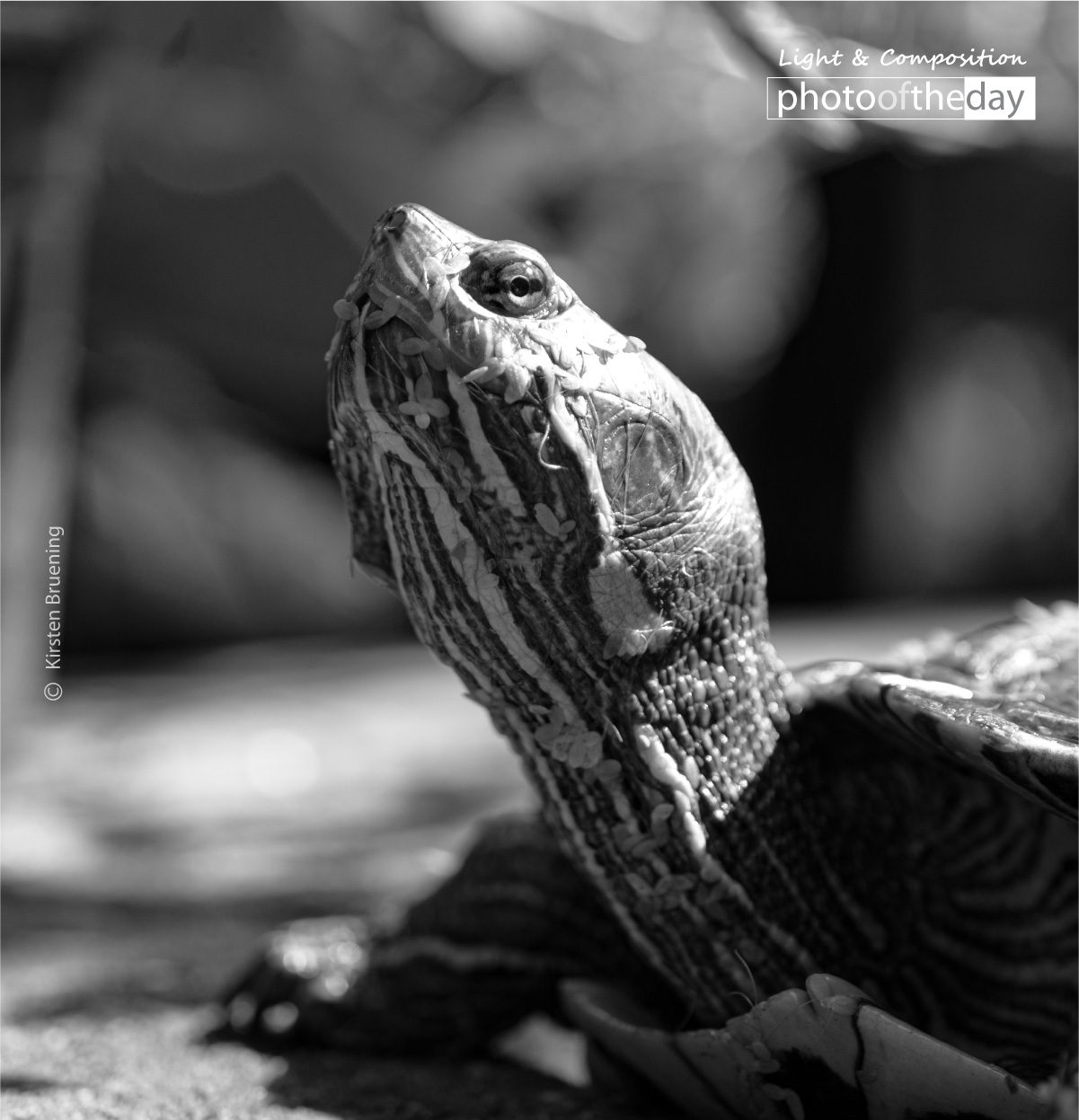 Turtles have inhabited the earth for about 220 million years. These unique animals lived on this planet even before the dinosaurs and are considered the oldest symbol in the world. The turtle is the ancient symbol of Mother Earth. The turtle stands for the power of rest and that all in life is giving and taking. I took this photo on a sunny Sunday afternoon when I walked through the botanical garden with my daughter. The turtle stretches her head towards the sun and enjoys the warmth. The closeness to an extraordinary animal and the peace it radiates in this moment had to be captured on a photograph.