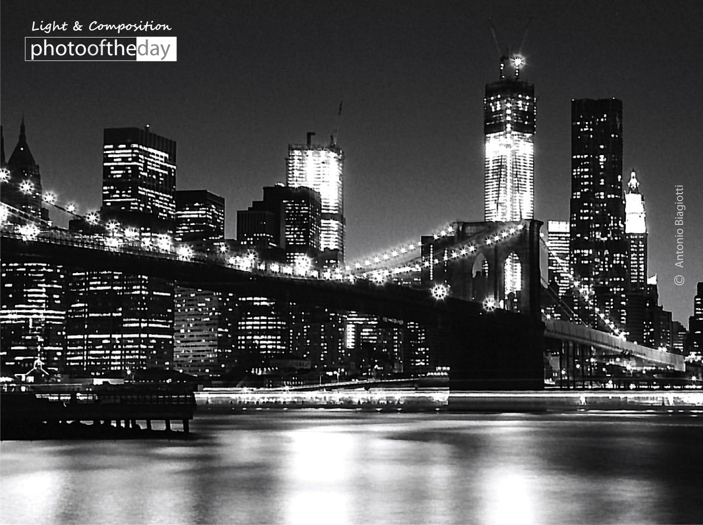 The skyline of New York needs no introduction and by visiting the big apple I couldn’t resist photographing one of its symbols. I wanted a scene with a strong contrast, I exposed for 30 seconds and I calculated to over-develop the film. The glittering skyscrapers and the reflection of the lights on the water show me that I saw right.