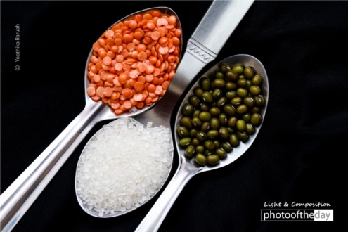 I took this photograph on 26th January 2019 on Indian Republic Day. The ingredients in the picture are masur pulses (depicting the Saffron color), sugar (showing the White color), and moong (indicating the Green color) of the India flag. It was taken inside a room with no external lighting apart from the external flash light.