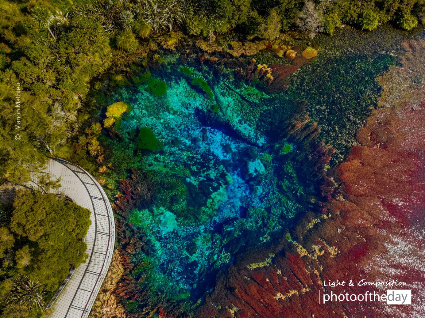 Te Pupu Spring is a well known and famous place in the south island of New-Zealand. Protected by Maoris, this amazing place is the purest spring of the country and one of the most pure water in the entire world. From the sky, the incredible transparency of the water permit to discover the underwater environment.