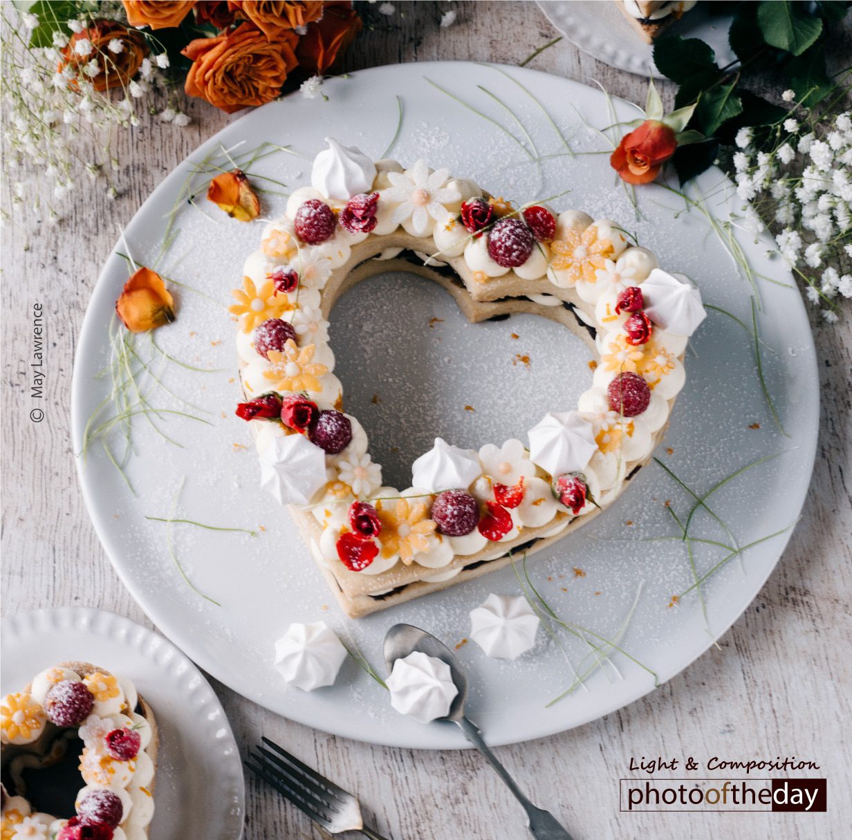 Sable biscuit celebration “cakes” has been the recent trend and I wanted to create one. So what better opportunity is there than Valentine’s Day to create a Heart Shape Sable Biscuit Cake? I created a recipe with orange blossom area and orange ganache, garnished with Swiss meringue and petite chocolate flowers. The heart also represents my passion for pastry cooking. The photo was shot in my home studio in natural light with the help of a reflector to create a little shadow. I used orange roses to represent the orange flavour of the filling.