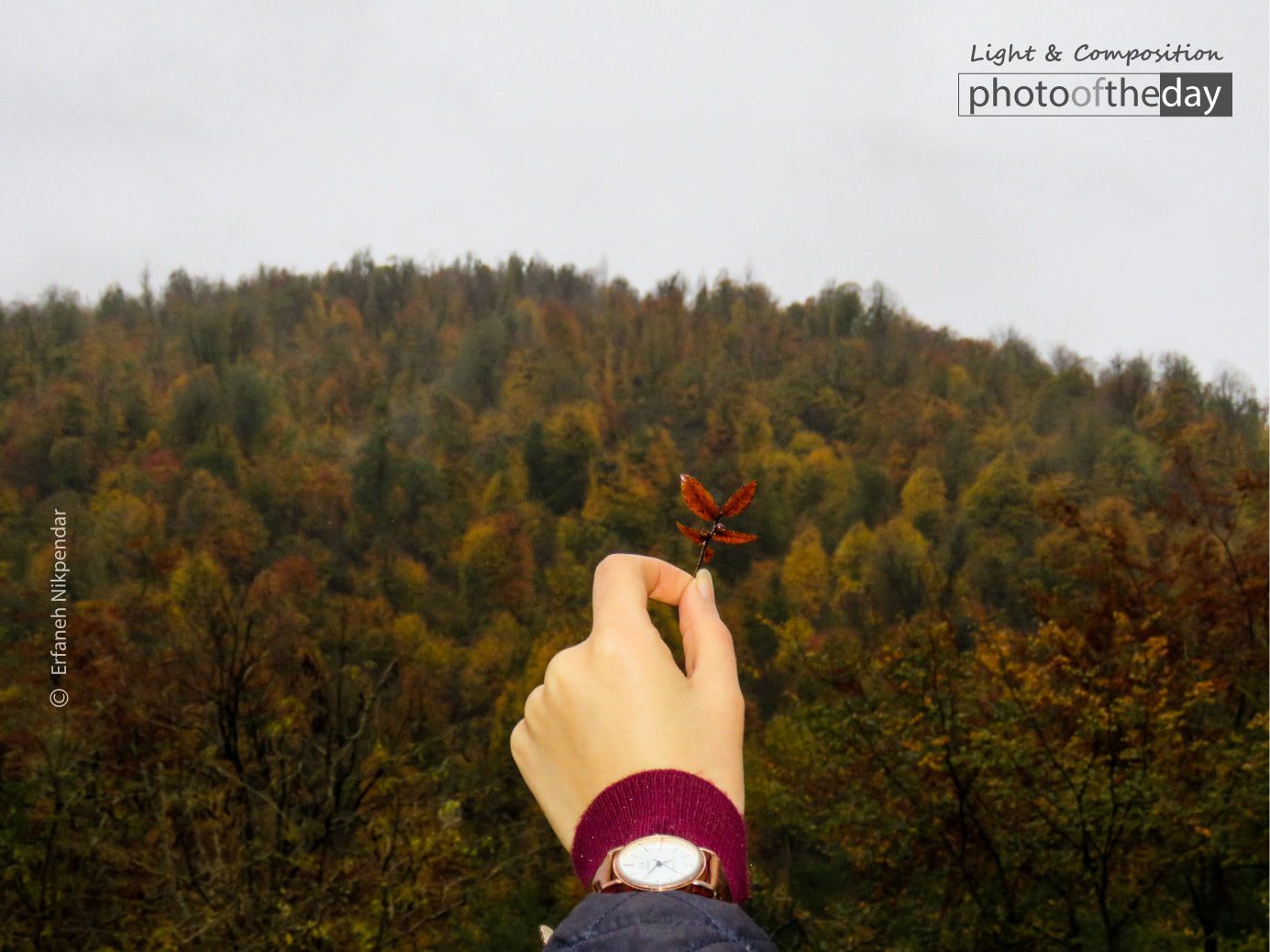 I was walking on the rocks and stopped, and found this leaf, which seemed to me drawn into the small branch that was right next to the rock. When I cut it and cleaned it, I raised my hand to make sure the leaves were comfortable, but this time, instead of them, I saw a forest that was the mother of this leaf.