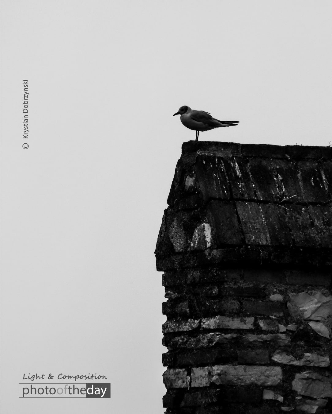 Taken in Italy, small city called Sirmione on the nail putted in Garda lake from the bottom up. Lake was a little misty that day, so it created nice contrast between close and faraway objects. The seagul was standing there on the edge of the wall, looks like waiting for someone to come through the lake entrance.