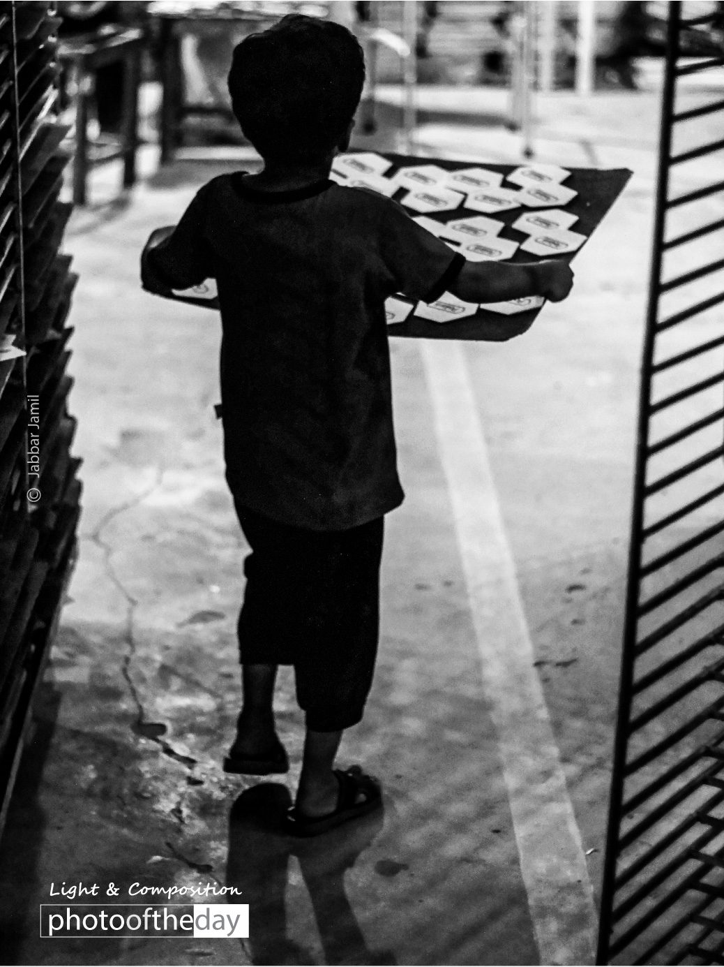 A Boy was helping his father in the factory. He came to visit the factory and was walking around giving his dad a little help as well as bit of trouble. As I was looking for a black and white photo, this looked a perfect opportunity, when kid was going away between the racks and light was in opposite direction.