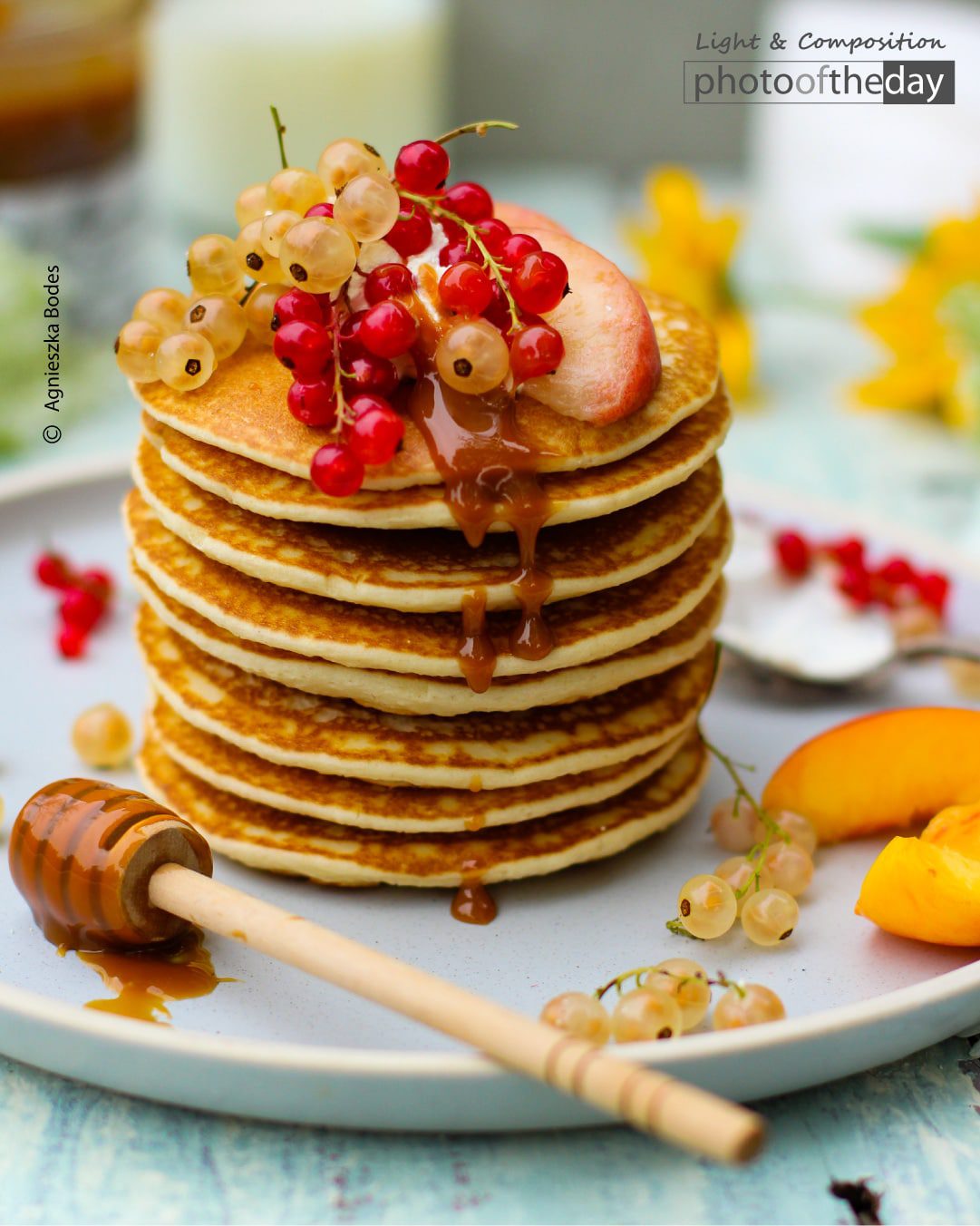 There is nothing like a towering stack of pancakes topped with the fresh fruit. I remember setting this scene on the picnic table, in the park. The styling was based on contrasting colors and interesting textures. My goal here was to capture the glossy caramel sauce dripping down the sides.