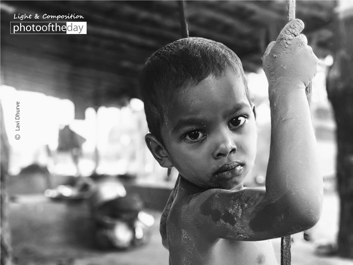 Before the arrival of the rainy season in our village, the house is repaired properly in the summer season. So that the roof of the house does not drip in the rain, the walls do not fall, the land of the house is covered with mud, because most of the houses are made of mud. This child, stained with the same wet clay, was swinging in a swing inserted outside his house, which I have captured in my picture and whose name is Saurabh, who will be just 3 to 4 years old.