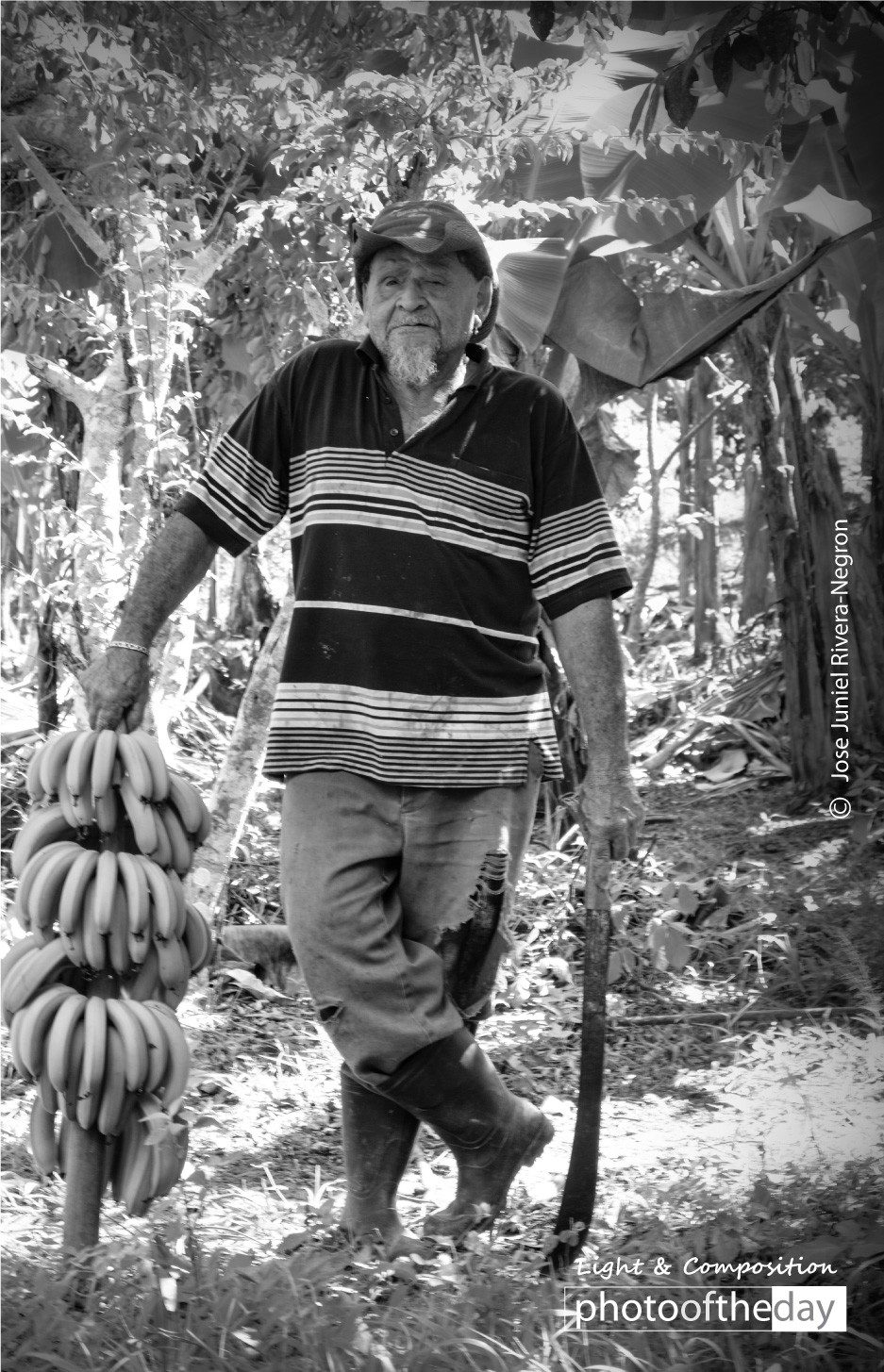 This photo was taken while visiting my beautiful Island of Borinquén that is called now Puerto Rico. Most of the tittle is in Spanish because it wouldn’t sound the same in English, but’ Jíbaro’ is a farmer who grows in his own farm and ‘Borinqueño’ is also called a person that was born in Puerto Rico. This was at my grandmother’s work field where I spent most of my childhood. I asked my uncle if he could pose a little with his “machete” in one hand and a whole branch of green bananas on his other. A very traditional phoyograph of a Jibaro Borinqueño.