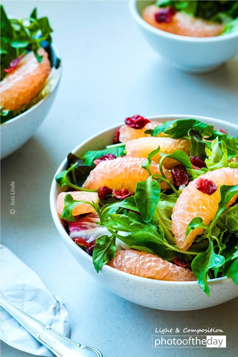 This pomelo & cranberry salad was shot on big beautiful sunny day in Bangkok. Pomelo is a little like grapefruit in many ways, a bit more sweet than bitter. It’s a member of the citrus family and comes in pink and yellow varieties For this photograph I choose the pink variety, to show a great contrast to the greens of the salad leafs.
