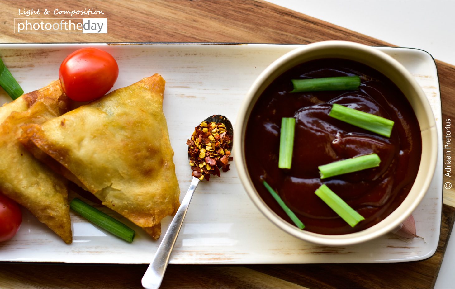 Samosa dishes are well known in the Middle east and Central Asian regions. They are also known for it’s spicy after bite which made it easy to link these ingredients together. The sauce on the side adds to rounding off the taste with some green onion to add to the freshness. The light from the side supported the photograph well in highlighting the various colors and textures.
