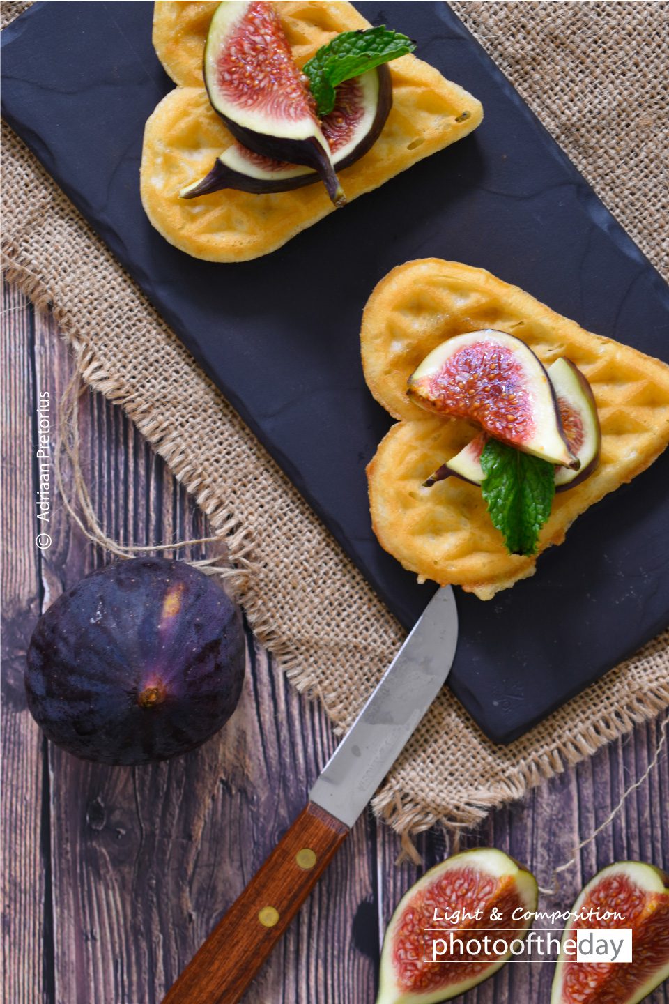 Working with good quality figs in season can provide you with the best composition options for a photograph. These fruits brought out the character of the whole plate and the colors being either whole or cut works well together. The mint leave broke the color and supported in the final presentation.