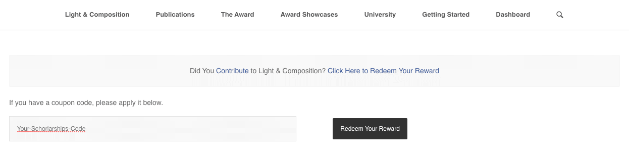 First all of click on the enrol button from your desired program page. You can see the example in the image below. Then clicking enrol button will take you to the checkout page. In the checkout page, you can see “Did You Contribute to Light & Composition? Click Here to Redeem Your Reward” Please click into that link and paste your scholarships/grants code.
