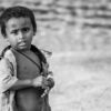 The shallow depth of field renders the background in a soft, ethereal blur, suggesting an expansive, undefined outdoor setting, possibly coastal, which further isolates the boy as the sole focal point. This deliberate artistic choice emphasizes his presence and the raw emotion conveyed through his expression and slightly parted lips. The monochromatic palette strips away distractions, allowing the viewer to focus entirely on the boy’s humanity and the subtle textures of his skin against the rougher fabric.