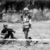 The monochromatic palette intensifies the emotional resonance, stripping away distractions to reveal the raw textures of their existence—the worn fabric, the dusty ground, the lines on the woman’s face. This choice underscores a universal narrative of care and resilience. The background, subtly blurred, hints at a bustling, perhaps challenging, environment with makeshift structures and a banner, grounding the subjects in a specific, yet relatable, context of daily life. The atmosphere is one of quiet contemplation, a moment suspended in time that speaks to enduring human bonds amidst humble surroundings.