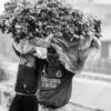 This compelling black and white photograph captures two women in a moment of profound physical and emotional labor. The composition is masterfully balanced, with the figures positioned against a stark, almost ethereal background, emphasizing their forms and the substantial bundles of firewood they carry on their heads. The monochromatic palette strips away distractions, drawing the viewer’s eye to the intricate textures of the wood, the worn fabric of their garments, and the weathered lines on their faces, imbuing the scene with a timeless, sculptural quality.
