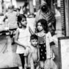 The photograph presents a stark and compelling portrait of three figures – an elder woman, a young girl, and a child – rendered in a masterful monochrome palette. The composition is anchored by the central figure of the woman, her gaze direct and unwavering, conveying a quiet strength amidst hardship. The textures of their clothing and the surrounding landscape are richly detailed, emphasizing the tangible reality of their existence. The shallow depth of field draws focus to the subjects, while the blurred background of sparse vegetation suggests a harsh, unforgiving environment. The interplay of light and shadow sculpts their forms, highlighting the lines etched by time and circumstance on the woman’s face, and the vulnerability in the children’s expressions.