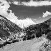 The photograph presents a stark and compelling landscape, dominated by the monumental presence of the Himalayas. The monochrome palette amplifies the textures of the rugged terrain – the scree slopes, the winding dirt road, and the imposing rock faces – creating a sense of austere beauty. The composition is masterful in its use of leading lines, with the road drawing the viewer’s eye deep into the valley, towards the distant, snow-capped peaks. The dramatic cloud formations, rendered in shades of gray, add a dynamic element to the scene, suggesting both the power and the ephemerality of nature.