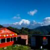 The photograph presents a vibrant tableau of a high-altitude retreat, framed by rustic architecture and an expansive, brilliant blue sky. The composition masterfully guides the eye along a gentle upward path, flanked by a textured stone-clad building on the left and a striking red-roofed structure on the right. Dominating the mid-ground, a prominent sign declares “Peaceful Himalayan Camping Zone,” its painted snow-capped peaks echoing the distant, hazy mountains that subtly anchor the horizon. The crisp, clear daylight illuminates every detail, from the rough-hewn timber and stone textures to the lush green foreground, creating a palpable sense of freshness and inviting tranquility.