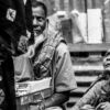 The photograph presents a compelling study in intimate portraiture, framed within the confines of a modest domestic space. The monochrome palette amplifies the textures of the worn surroundings – the chipped paint, the stacked metal cookware, the woven baskets – creating a visual tapestry of lived experience. The central figure, an elderly woman, is positioned with a quiet dignity, her hands engaged in the preparation of food, a gesture that speaks to sustenance, tradition, and the enduring rhythms of daily life. The composition is deliberately tight, drawing the viewer into the woman’s world, fostering a sense of proximity and shared humanity.