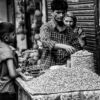 The photograph presents a compelling study in contrasts, framed by the claustrophobic geometry of a narrow alleyway. A young boy, positioned centrally, meets the viewer’s gaze with a quiet dignity, his presence a beacon of resilience within the densely packed environment. The surrounding space is defined by hanging fabrics – a vibrant tapestry of patterns and textures – that both obscure and reveal, creating a sense of layered intimacy. The monochrome palette amplifies the textural richness, emphasizing the interplay of light and shadow and lending the scene a timeless quality.