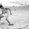 The photograph presents a compelling portrait of a young girl, captured in a moment of quiet introspection as she walks along a textured shoreline. Rendered in a timeless black and white, the image emphasizes form, light, and the subtle interplay of textures. The girl, positioned slightly off-center, commands attention with her upright posture and distant gaze, creating a powerful sense of solitary presence against the soft, blurred expanse of water in the background. Her simple dress and bare feet connect her intimately to the natural environment, while the scattered debris on the sand adds a layer of raw authenticity to the scene.
