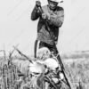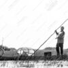 The photograph presents a study in contrasts – the weathered strength of an elder and the focused energy of youth, bound together by their shared reliance on the river. The monochrome palette amplifies the textures of the scene, from the rough bark of the trees lining the bank to the worn fabric of the man’s clothing and the metallic sheen of the outboard motor. The composition is anchored by the verticality of the standing figure, his gaze directed forward with a quiet determination, while the seated figure, partially obscured, suggests a dynamic interplay of action and support. The water’s surface, reflecting the sky and surrounding foliage, creates a sense of depth and tranquility, subtly disrupted by the boat’s wake.