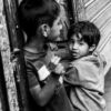 The photograph presents a striking study in contrasts, rendered in stark black and white. Two young boys, positioned within a claustrophobic urban environment, engage in a direct and compelling exchange of gazes. The composition is tightly framed, emphasizing the intimacy of the moment and the textured decay of the surrounding architecture. Light falls unevenly, sculpting the boys’ faces and highlighting the rough surfaces of the brick wall, creating a dramatic interplay of light and shadow that draws the viewer’s eye to their expressions. The boy on the right, facing the camera, possesses a quiet dignity, his gaze both vulnerable and resolute. The other boy, partially obscured, adds a layer of mystery and suggests a shared world, a silent understanding forged in their surroundings.