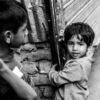 The photograph presents a poignant study in intimacy and vulnerability, framed by the stark geometry of a corrugated metal doorway. Two young boys occupy the space, their bodies angled towards each other in a gesture of quiet connection. The older boy, his gaze averted, seems to offer a protective embrace to the younger, whose direct and inquisitive stare draws the viewer into the scene. The monochrome palette amplifies the texture of the weathered metal and the boys’ skin, emphasizing the rawness of their environment and the immediacy of their interaction.