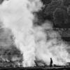 The photograph presents a powerful tableau of human endeavor against the raw force of nature. A lone, silhouetted figure stands at the heart of a vast, smoke-filled landscape, tending to a smoldering pile. The composition masterfully uses negative space and dramatic contrast, with the dark, textured foreground grounding the scene while the background dissolves into a luminous, golden haze. The figure, rendered almost entirely in shadow, becomes a universal symbol of labor and resilience.