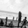 The photograph presents a striking study in contrasts, utilizing a high-key monochrome palette to render a scene of quiet contemplation. Tall, slender trees dominate the frame, their dark silhouettes creating a rhythmic verticality that draws the eye towards a distant, shimmering horizon. The composition is deliberately sparse, emphasizing the negative space between the trees and the figures, fostering a sense of solitude and vastness. The figures, two children, are rendered as dark shapes, their forms simplified and almost abstracted, adding to the dreamlike quality of the image.