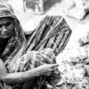 The photograph presents a study in contrasts – the fragility of the human form against the harsh geometry of a crumbling environment. A woman, her body etched with the lines of labor and time, is captured in a moment of focused effort, meticulously breaking stone. The monochrome palette amplifies the textures of weathered skin, rough fabric, and fractured concrete, creating a visual symphony of grays that speaks to endurance and the weight of existence. The composition, tightly focused on the subject and her immediate surroundings, draws the viewer into her intimate world, emphasizing the physicality of her work and the quiet dignity of her struggle.
