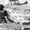 The photograph presents a study in quietude and resilience, rendered in stark monochrome. Three young figures, partially obscured by a landscape of rough-hewn stone, are captured in a moment of introspective focus. Their bodies, angled inward, suggest a shared intimacy or a collective absorption in a private world. The textures are paramount – the jagged edges of the rocks contrast with the softer forms of the children’s clothing and skin, creating a tactile tension that draws the viewer into the scene. The composition, with its layering of forms and subtle diagonals, guides the eye through the image, emphasizing the children’s vulnerability within the imposing natural environment.