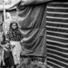 The photograph presents a study in texture and resilience, rendered in stark monochrome. The subject, an elderly man with a long, flowing beard, is positioned within a tightly framed, claustrophobic space constructed of corrugated metal and woven materials. His hands, gnarled and marked by labor, are the focal point, actively engaged in a task that remains partially obscured, hinting at a life of continuous work. The lighting is dramatic, emphasizing the deep lines etched into his face and the intricate patterns of the surrounding environment. The composition, with its strong vertical and horizontal lines, creates a sense of both confinement and dignity.