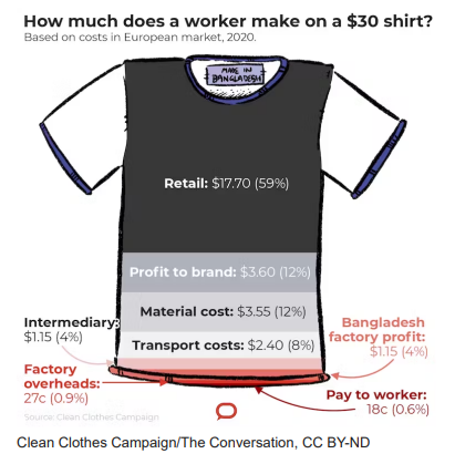 As a result of the high demand worldwide to keep prices low for clothing manufacturers, only 0.6% of the retail price of a t-shirt goes to the worker (see Figure A) (Rahman & Yadlapalli, 2021). This disparity creates a huge salary gap between CEOs and Bangladesh garment workers. According to Oxfam Australia, a CEO in a top fashion company in Australia earns up to $2,500 per hour, whereas a garment worker earns only the legal minimum wage of $0.39 AU per hour (see Figure B) (Brungs, 2023). The low wages of Bangladesh garment workers has created serious socio-economic problems for the worker and their family resulting in a life threatening struggle to make ends meet (The Borgen Project, 2023).