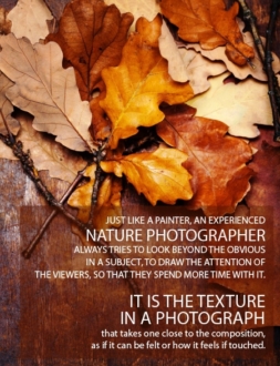 Just like a painter, an experienced nature photographer always tries to look beyond the obvious in a subject, to draw the attention of the viewers, so that they spend more time with it. It is the texture in a photograph that takes one close to the composition, as if it can be felt or how it feels if touched. Texture is the tactile quality of the surface of an object. It presents the viewer with an even more intense experience of one’s work.