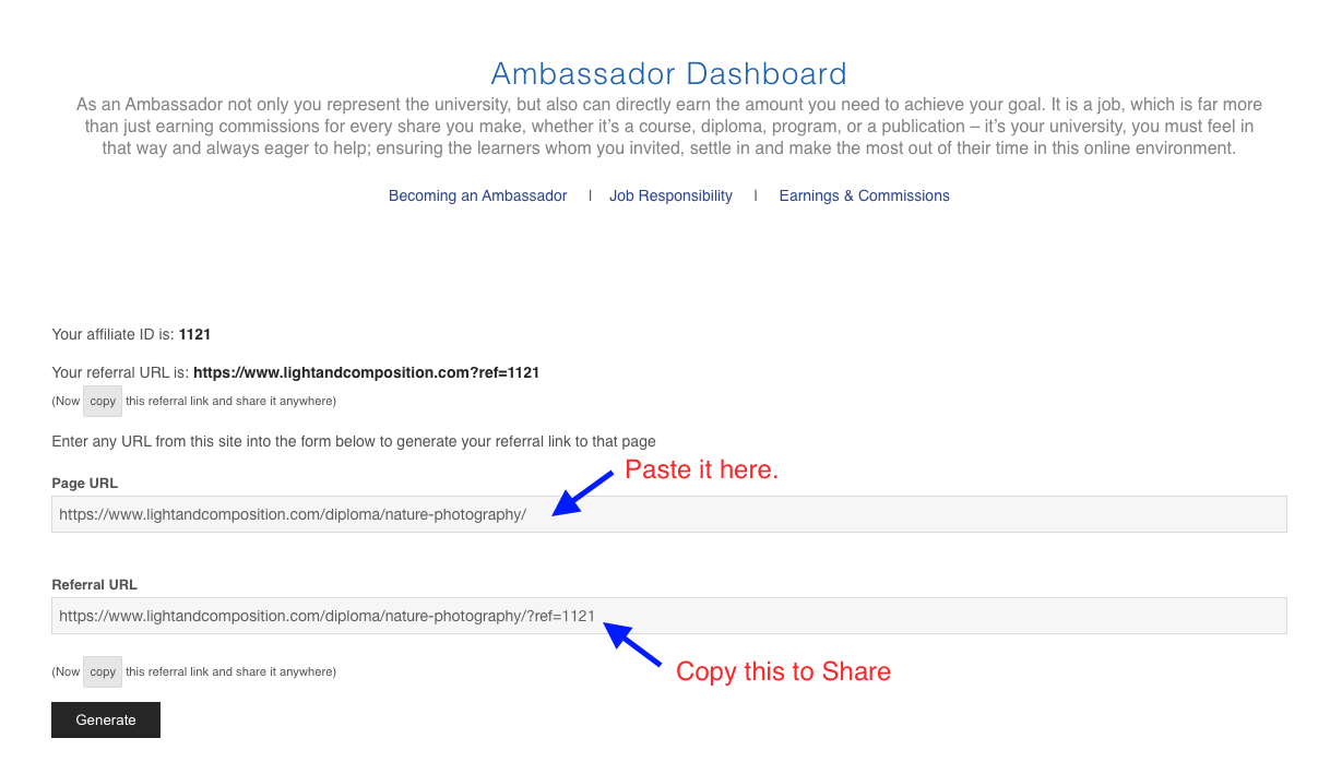 Go to the Generate Link Section Under Ambassador Dashboard and paste it in Page URL filed inside of that page than click Generate Link.