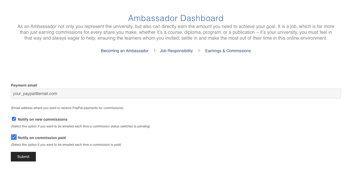 A successful enrolled or any university press publication purchases generate a commission amount that we will pay to you. Typically, you earn 10% from every completed purchased. Commission percentage applied to the amount of each course, program, or publication. All the commissions generated by the enrolment or orders are stored in the “Commissions” section of Ambassador dashboard or “Get Paid” section of your account dashboard.